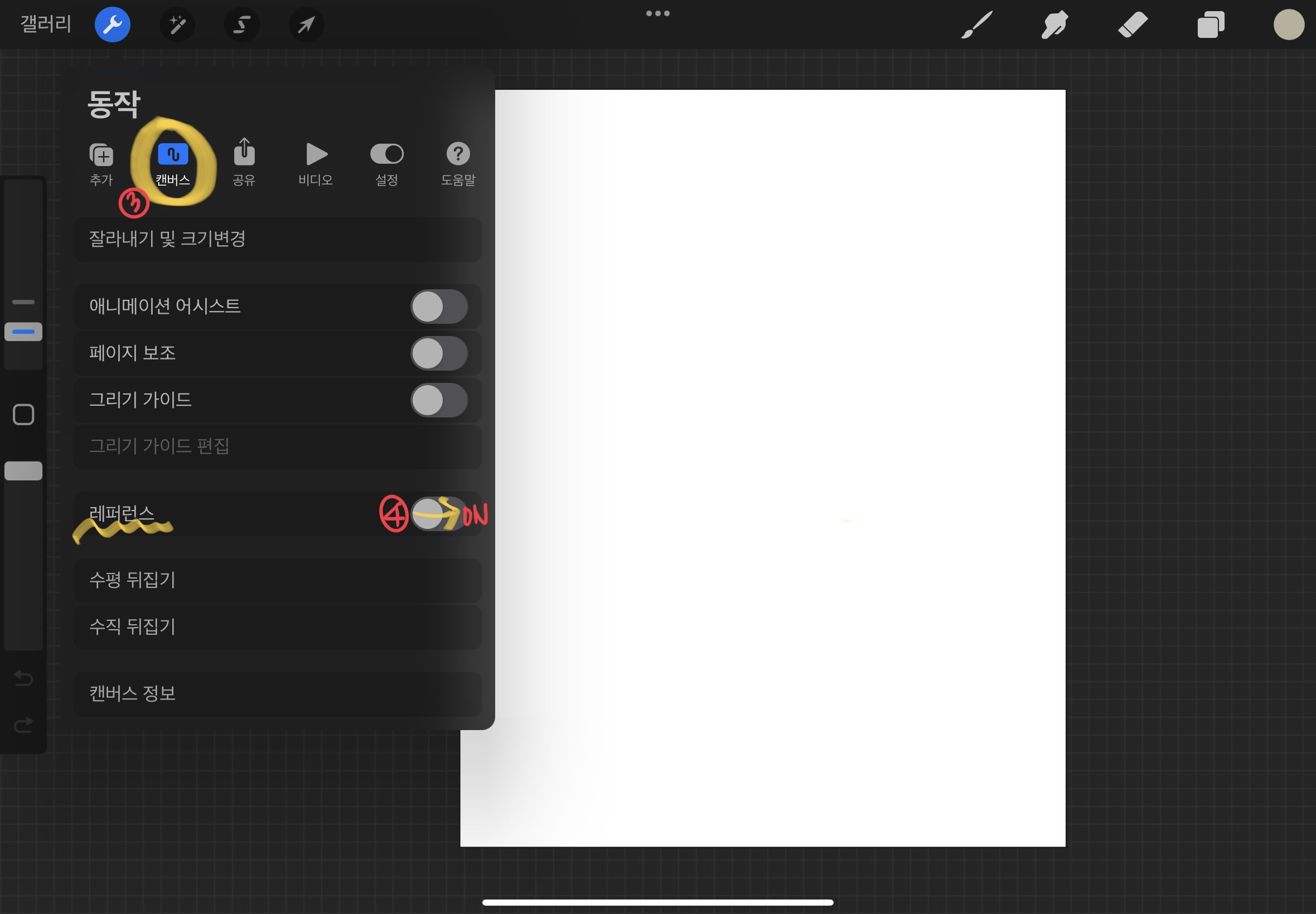 3) ‘캔버스’클릭 - 4)‘레퍼런스’ 우측으로 슬라이드(ON) : 레퍼런스 새창이 열립니다.