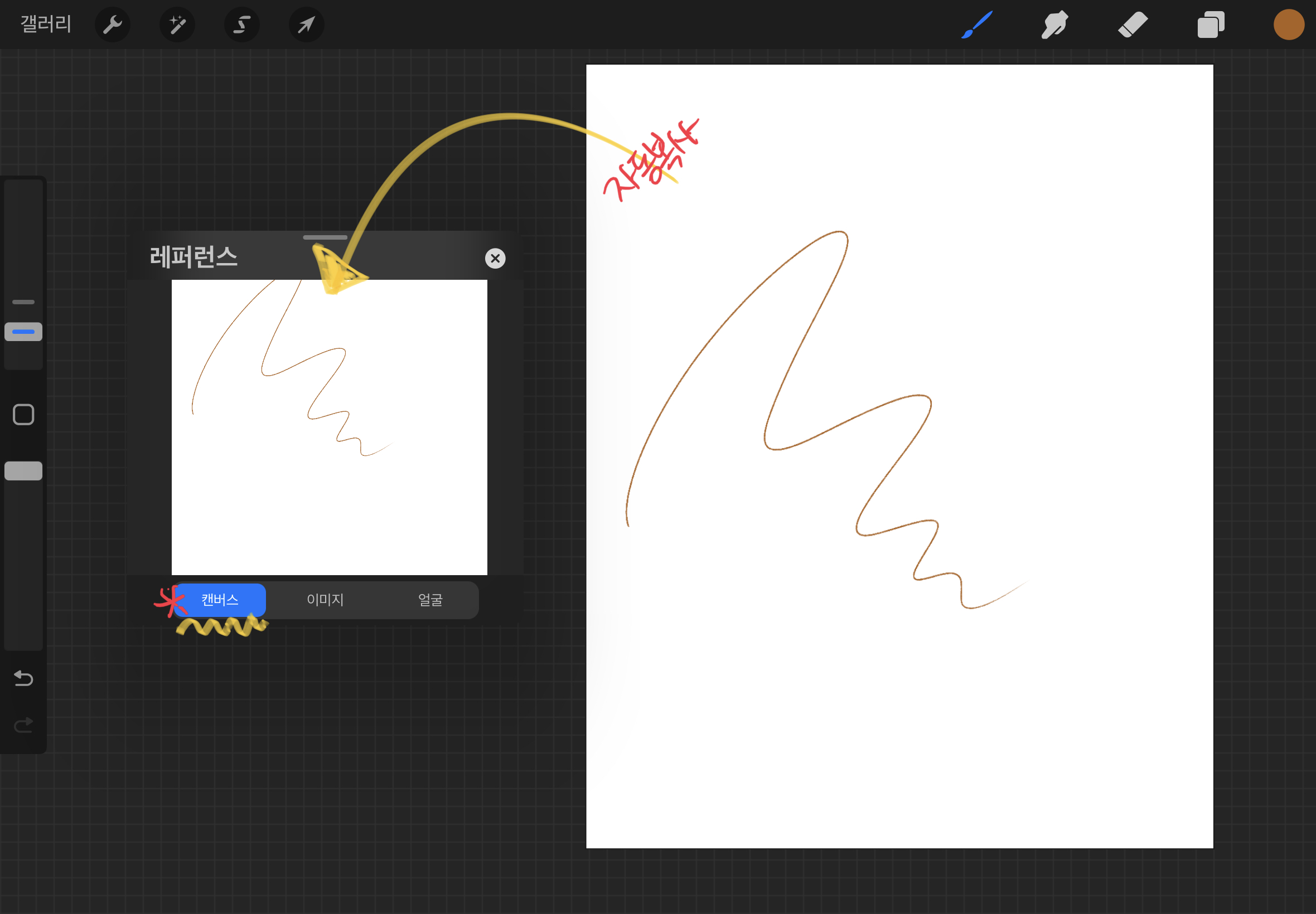 하지만, 그리고 싶은 것들을 상상력으로만 그리기에는 아직 실력이 많이 부족하다. 실제를 보고 그리는 것도 구도, 비례 감각이 떨어져서 스케치를 하는것 조차 어렵다. 그러다보니, 평소 찍어둔 사진과 구글링을 통해 내가 그리고자 하는 것들을 미리 수집을 하게된다. 처음에는 포토크리에이트 기능을 잘 몰라서 캔버스 위쪽에 사진을 조그만하게 불러와서 보고 그렸다. 입시 미술하는 학생들이 도화지 왼쪽에 사과 사진을 두고 그리는 것처럼 말이다. 그러던 중 ‘레퍼런스’라는 기능을 알게되어 유용하게 쓰고있다. 한번만 보면 당연하게 쓸 수 있는 기능이지만, 처음 아이패드 드로잉을 하는 사람들은 이런 기능이 있는지도 모를 수도 있으니… 나같은 사람을 줄이고자, 블로그에 기능 사용법을 남깁니다.